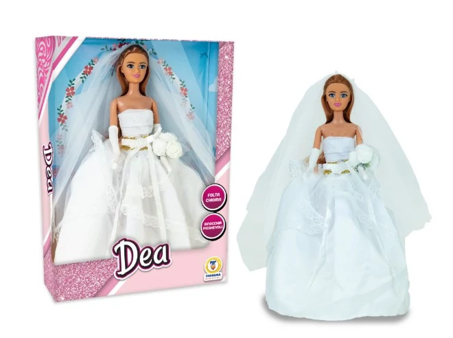 Varázsold ünnepivé a pillanatot ezzel a gyönyörű Dea márkájú mennyasszony babával, amely eleganciájával és aprólékos kidolgozásával azonnal magára vonja a figyelmet. A 30 cm magas baba klasszikus menyasszonyi ruhában pompázik, amelyet romantikus kiegészítők tesznek teljessé.