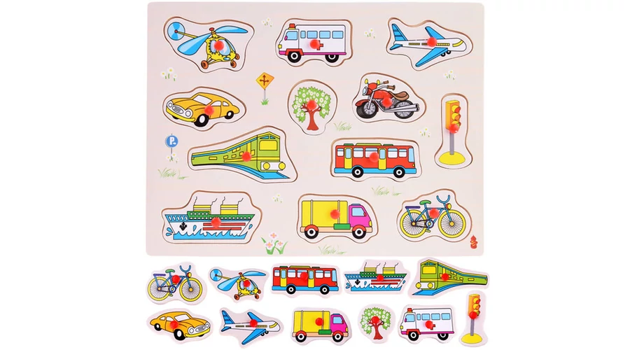 Egy fából készült kirakó, melyben különféle közlekedési eszközök és az út mentén látható tárgyak láthatók, a tanulás és a szórakozás ötvözete. Játék közben a gyermek gyakorolhatja az összehasonlítás képességét, az érzékenységét és a szem-kéz koordinációt. Ezenkívül a kisgyermeknek lehetősége van új szavakat tanulni, vagy a beszédkészséget gyakorolni az adott jármű által kiadott hangok utánzásával. A fából készült kirakók biztosan sok órányi szórakozást nyújtanak majd.