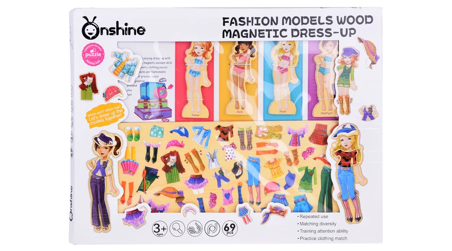 A Ruhák és Divat Öltöztetős Mágneses Kirakós egy fantasztikus, kreatív divatkészlet minden fiatal divatstylist számára. A készlet 4 bájos modellt és 65 ruházati kiegészítőt tartalmaz öltöztetésükhöz és stílusuk kialakításához. A modellek alsóneműt viselnek, a divatstylist feladata pedig az eredeti stílusuk megteremtése. A stylisttól függ, hogyan öltözködik egy adott modell, legyen az klasszikus, avantgárd, sport, báltermi stb. stílus. Ez a mega kreatív készlet rengeteg fantasztikus szórakozást nyújt minden lánynak. Emellett nagyszerű gyakorlat a finom motoros készségek, a stílusérzék, a színek és a szabásvonalak fejlesztésére is.