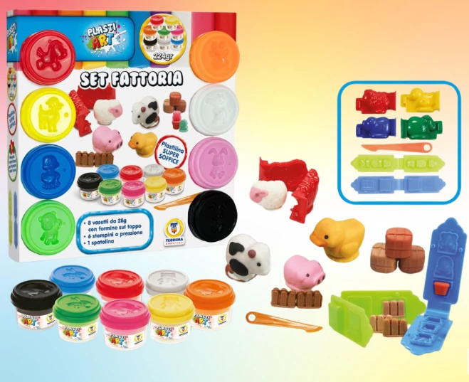 8 tégely színes gyurma (egyenként 28g), többféle élénk színben: fekete, kék, piros, fehér, narancssárga, zöld, rózsaszín és sárga.