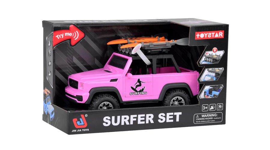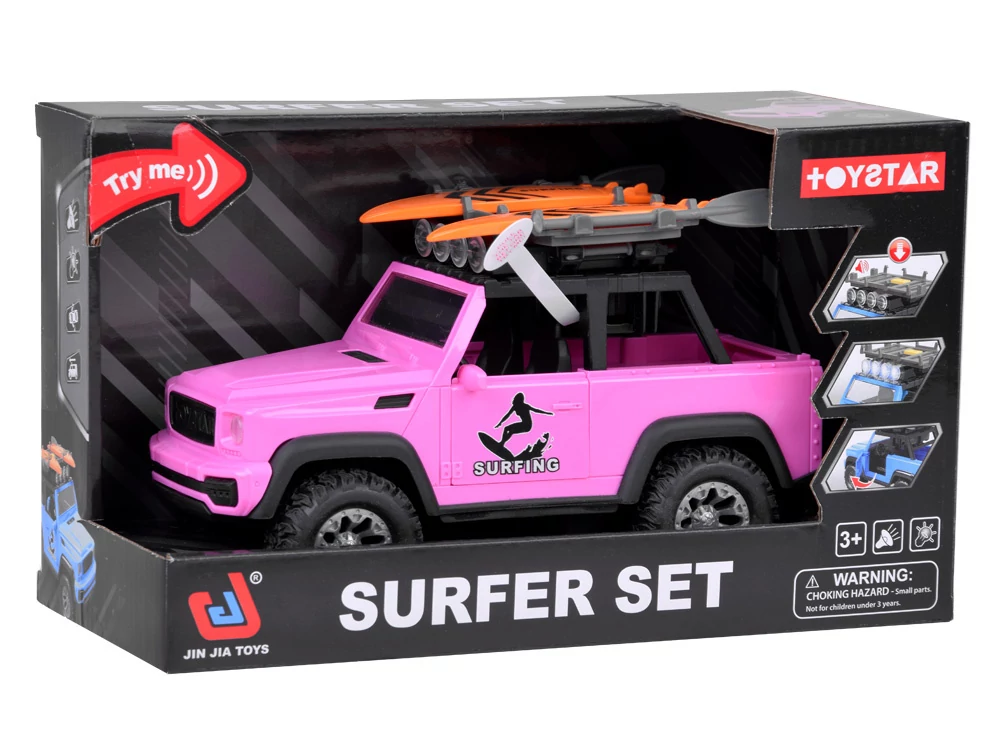 Egy rózsaszín autó szörfdeszkákkal minden lány álma! Ez az autó igazán különleges feladatokra való. A terepjáró nyitható ajtókkal, leengedett csomagtartó fedéllel, nagy, gumiabroncsokkal, és fantasztikus, rózsaszín színben! Ez még nem minden, hiszen a tetején egy hang- és fénypanel található, amelyre két szörfdeszka számára tetőcsomagtartót szerelhetsz! Készen állsz egy kalandra? Szóval indulhatunk!