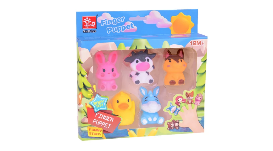 5 db gumiból készült, farmállat alakú ujjbáb, mindegyik más színben (nyúl, tehén, kutya, kacsa, szamár), méretük kb. 5 cm x 4 cm x 4 cm.