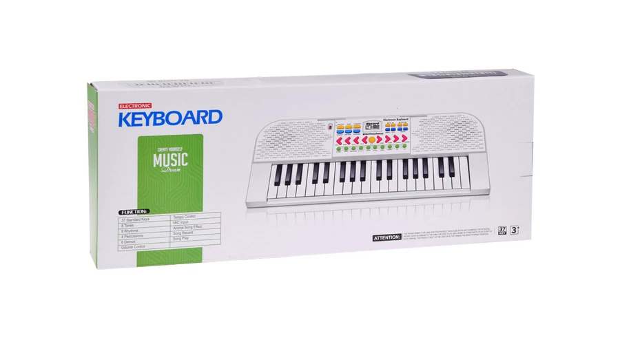 A szintetizátor a következőket tartalmazza: - 37 billentyűs billentyűzet, - KI/BE gomb a játék be- és kikapcsolásához, - hangerőszabályzó, - tempóváltó gomb, - DEMO funkció, amely bemutatja a készülék képességeit, - ütőhangszerek hangjai, - 8 különböző ritmus - a keringőtől a szambáig, - 8 gomb a hangszerváltáshoz, - felvétel (REC) és lejátszás (PLAY) funkció, - mikrofon.