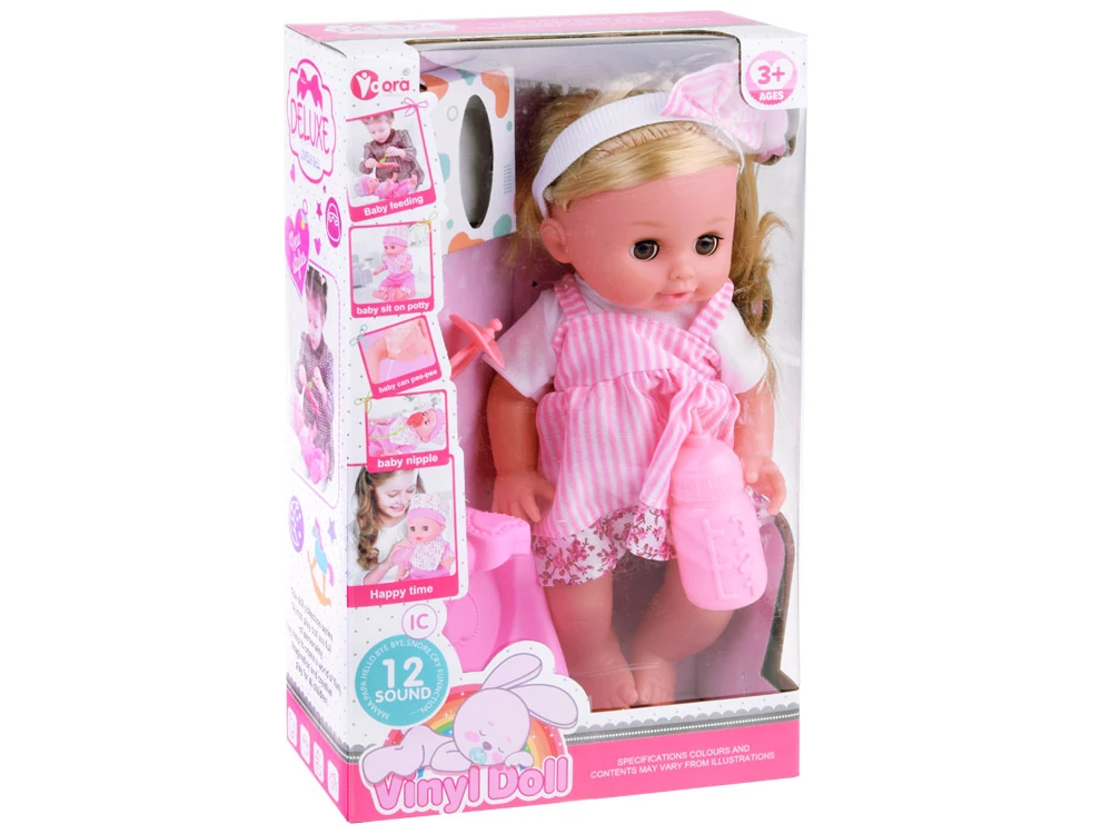 A bájos, interaktív baba imádja a gyerekek társaságát és a játszó anya-gyermek, vagy gondozó társaságát. A fej, a karok és a lábak kemény gumiból, míg a test műanyagból készült. A baba egy gyönyörű fehér és rózsaszín virágmintás szegélyű ruhát és egy fehér pólót visel. A fejet masnival díszített fejpánt díszíti. Gyönyörű, mosolygós arcát hosszú szőke haj keretezi, amely fésülhető és különféle frizurákba - lófarokba vagy fonatba - formázható.