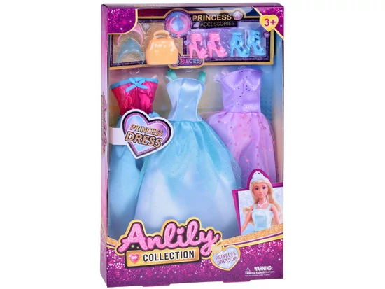 A szett három különböző ruhát tartalmaz, mindegyik egyedi szabású és színvilágú, így a gyerekek minden alkalomra variálhatják és párosíthatják őket. Két pár elegáns, magas sarkú cipő kifinomult megjelenést kölcsönöz, míg a szettet egy sikkes kézitáska, egy rózsaszín nyaklánc és nem is egy, hanem két finom korona teszi teljessé – tökéletes darabok bármelyik kis hercegnő számára.