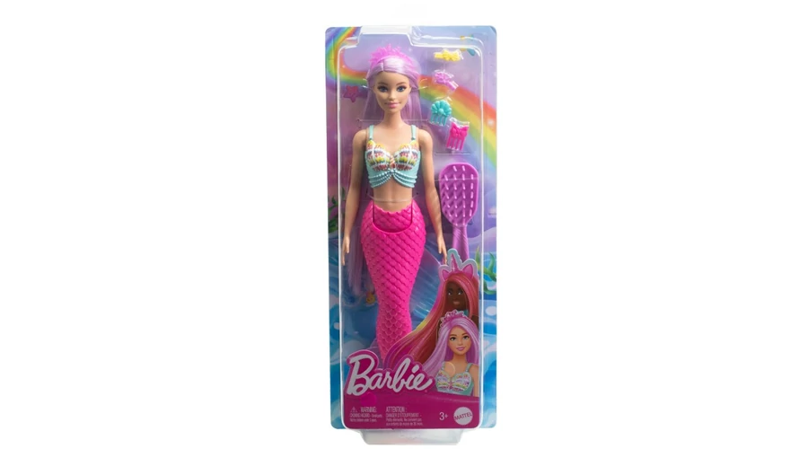 Barbie sellő baba fantáziadús történetmesélésre és frizurakészítésre inspirál extra hosszú hajával és kiegészítőivel. Formázd meg hosszú, pasztellrózsaszín, körülbelül 18 cm hosszú haját a mellékelt kiegészítőkkel, majd fésüld meg, és kezdd újra a mókát. Alkoss végtelen varázslatos frizurákat és álmodj meg víz alatti kalandokat. Légy fodrász egy hajkefével, 2 díszes fésűvel, 2 hajcsattal és egy tengeri témájú fejpánttal. Az olyan varázslatos elemek, mint a fejpánt és a tengeri ihletésű felső, egy csipetnyi varázslatot kölcsönöznek ennek a babának. A sellőbaba egy gyönyörű kagylómintás felsőt visel és rózsaszín farka van, uszonnyal.