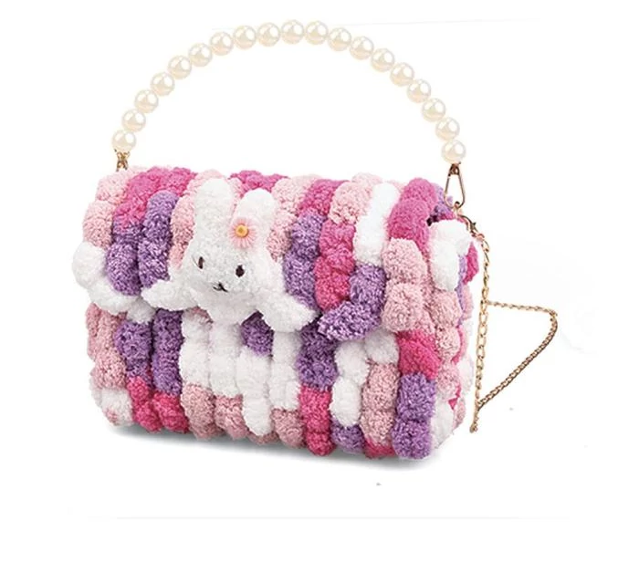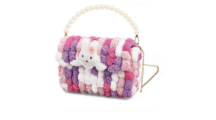 Puha, színes fonalat tartalmaz színes pomponokkal, amelyek egy bájos kézitáskát alkotnak.