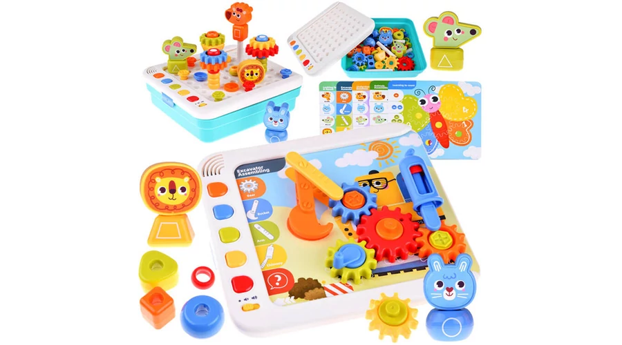 - színes blokkok, fogaskerekek, állatfigurák: zsiráf, nyúl, egér, oroszlán
