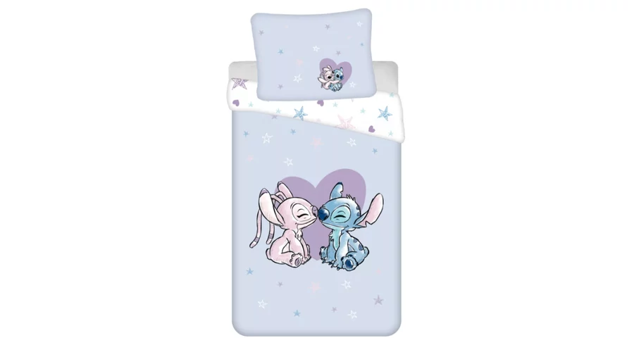 Disney Lilo és Stitch, A csillagkutya ágynemű Az ágynemű egyik oldala fehér alap, csillagokkal és szivecskékkel díszítve. A másik oldalt Angel és Stitch található lila alapon a háttérben egy nagy szívvel és csillagokkal. A Párnahuzat egyik oldalán lila alapon Angel és Stitch látható ahogy ölelik egymást.