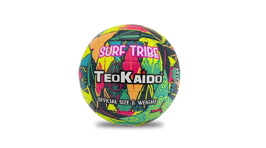 A röplabda színe és mintája: főként zöld, lila és rikító színek, és szörfdeszkák díszítik.
