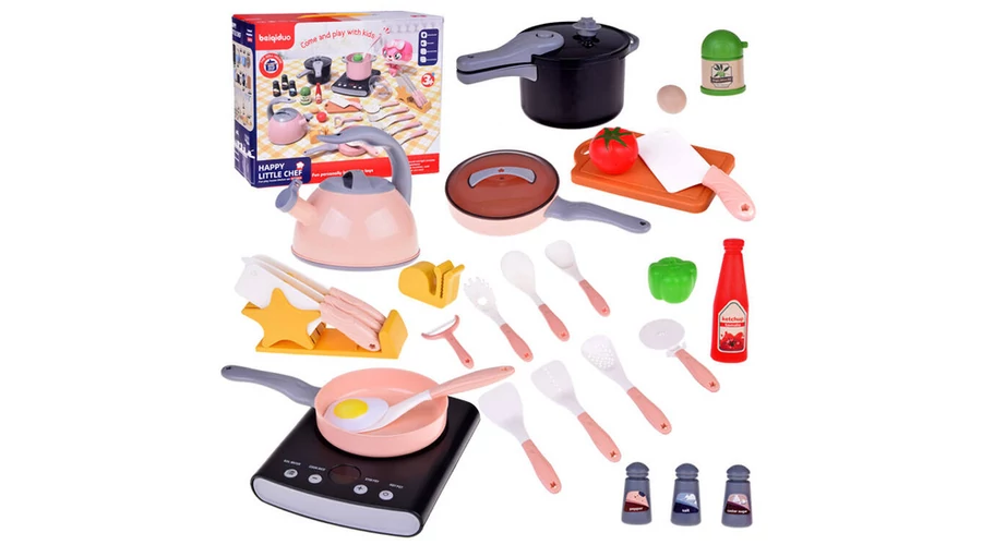 A gyerek gyakran szeretné utánozni az anyját, ahogy a családi étkezéseket készíti. Egy nagyméretű készlet, amely tartalmazza a konyhában szükséges edényeket, termékeket és kiegészítőket, segít ebben. Teljes egészében műanyagból készült. A tűzhely alján található gomb bekapcsolása után bekapcsol a fűtőlap kijelzője, aminek köszönhetően a kisgyermekünk a kijelző oldalán található gombok segítségével szabályozhatja a hőmérsékletet.