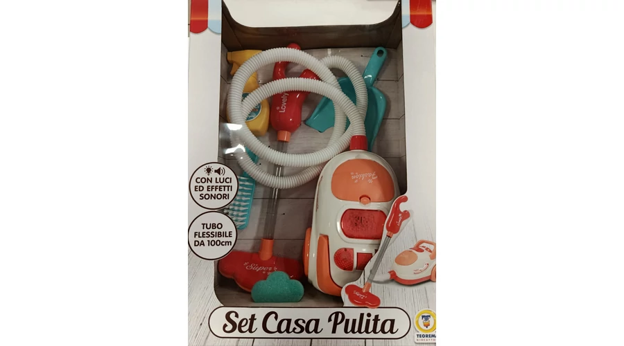 Valósághű játék porszívó – A központi darab egy játék porszívó, amely gombnyomásra hangot ad ki, így még élethűbb élményt nyújt.